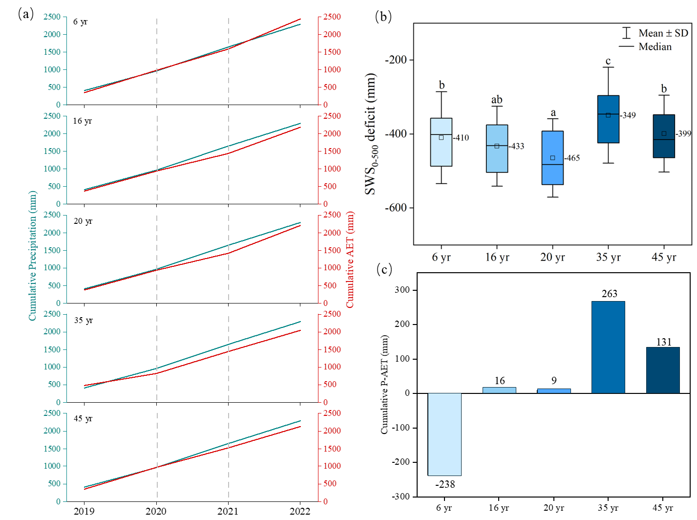 图22019-2022年不同林龄刺槐林累积降水量(P)和累积实际蒸散量(AET)分布(a);不同林龄刺槐林0-5 m土壤储水量亏缺分布(b);2019-2022年不同林龄刺槐林累积P-AET(c)