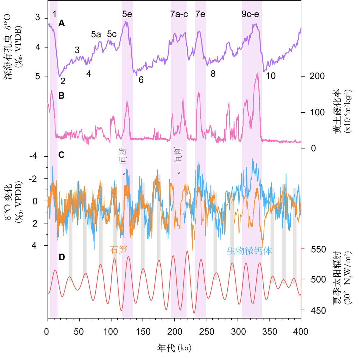 图2. 40万年以来记录对比。(A)深海有孔虫δ18O记录 (Lisiecki and Raymo,2005);(B)黄土高原西部黄土磁化率 (Sun et al.,2021);(C)生物微钙体δ18O记录(蓝色)和石笋δ18O记录 (橙色,Cheng et al.,2016);(D)夏季太阳辐射 (Laskar et al.,2004)