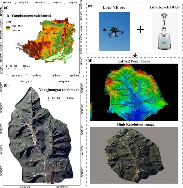 图1. (a) 羊圈沟小流域的位置;(b)羊圈沟小流域的DEM;(c)机载激光雷达和背负式雷达设备;(d)激光雷达点云和高分辨率影像数据