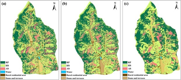 图2. 使用不同特征组合获得的植被分类结果: (a) 仅限光谱和纹理特征的组合;(b) 光谱、纹理和激光雷达衍生地形特征的组合;(c) 光谱、纹理和LiDAR衍生的地形特征和植被特征的组合
