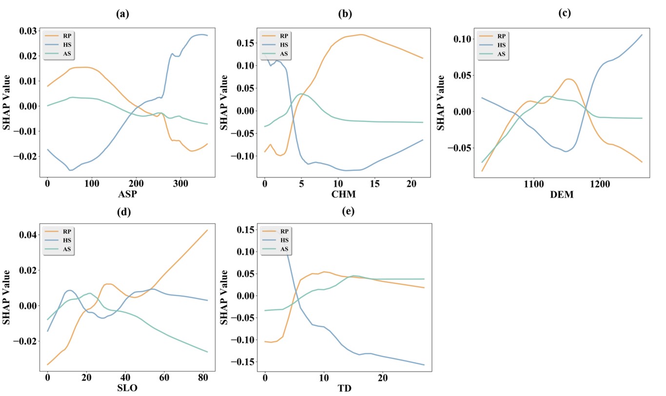 鉴于此,陕西师范大学焦磊副教授和中科院生态环境研究中心高光耀研究员合作,依托陕西黄土高原地球关键带国家野外科学观测研究站延安羊圈沟观测区,采用地面植被调查、无人机遥感航测和可解释机器学习等方法,基于Google Earth Engine平台,提出一套融合无人机高分辨率影像与机载LiDAR点云数据的植被高精度分类方法,并探究机载LiDAR在植被分类中的贡献机制。研究表明,加入LiDAR特征显著提升了分类精度,随机森林(RF)分类总体精度提升至99.36%。同时,利用机器学习可解释算法SHAP破译RF模型中各特征的贡献机制,结果显示冠层高度(CHM)、林分密度(TD)和高程(DEM)为分类效果提升的关键因子。本研究为复杂地形条件下高精度植被分类提供了有效的技术方案,并在理论层面打开了机器学习植被分类问题的“黑箱”,定量揭示了各类特征的贡献机制。